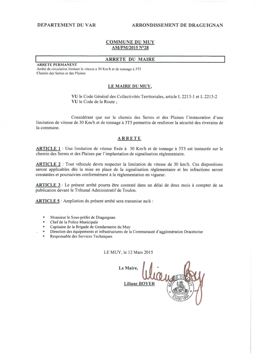 Arrêté permanent de circulation limitant la vitesse à 50 km/h et de tonnage à 3T5Vérignas, Micocoulier, Parrot, Moulin des Serres, Pesquier, Chaussièyes, Pélissier, Trois Cabanons, Rouvières, des Chênes, Cadenades, Bonnefont, Farigoulette, du Jas de la Paro, Tubanel, Chemin des Valises, des Hautes Pinèdes, Valettes, Pins Parasols, de la Roquette, Pétignons |
