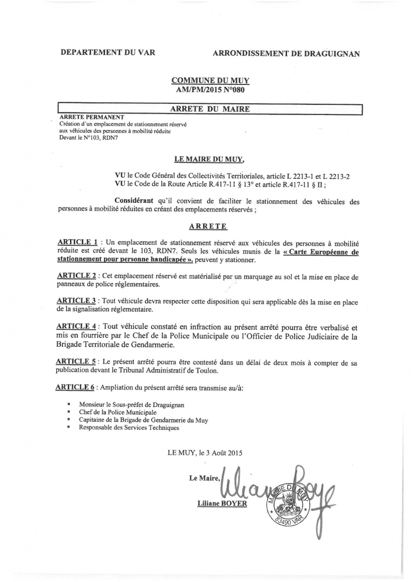 Arrêté permanent – Création d’un emplacement de stationnement réservé aux véhicules des personnes à mobilité réduiteDevant le n°103, RDN7 |