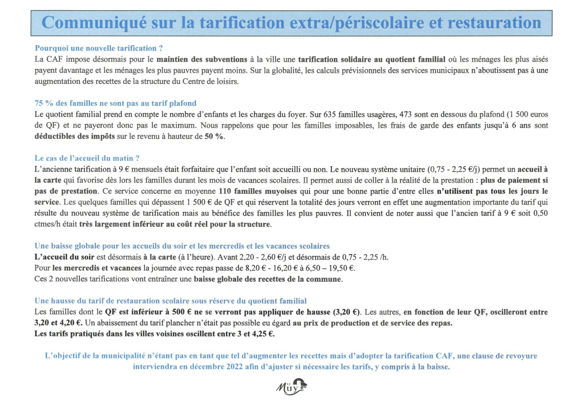 Communiqué de la ville du Muy suite à la délibération du conseil municipal du 30 mai 2022 portant mise en place de la nouvelle tarification des accueils péri et extra scolaires et de la restauration scolaire.